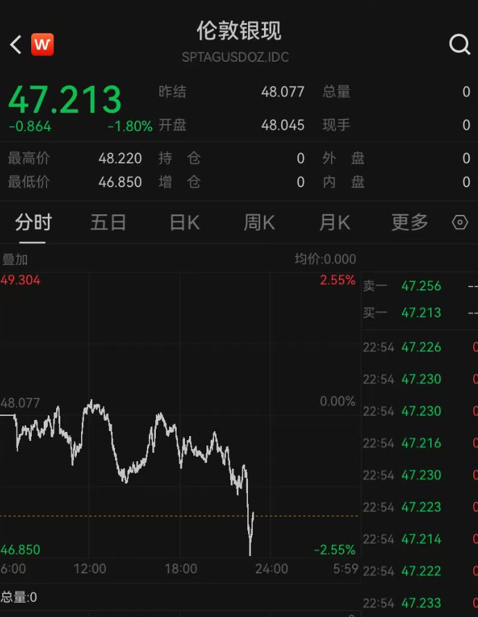 与此同时,白银、铜、锌等金属全线下跌,截至发稿,现银跌1.8%,报47.2美元/盎司。