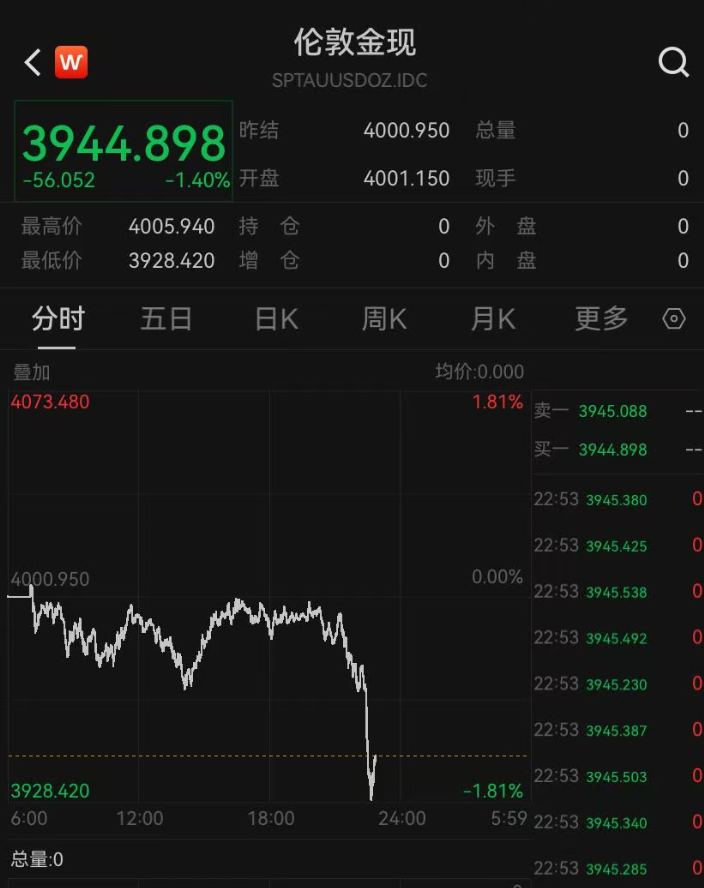 黄金跳水,现货黄金一度大跌1.8%。截至发稿,跌幅收窄至1.4%,报3944.9美元/盎司;COMEX黄金跌1.73%,报3944.5美元/盎司。