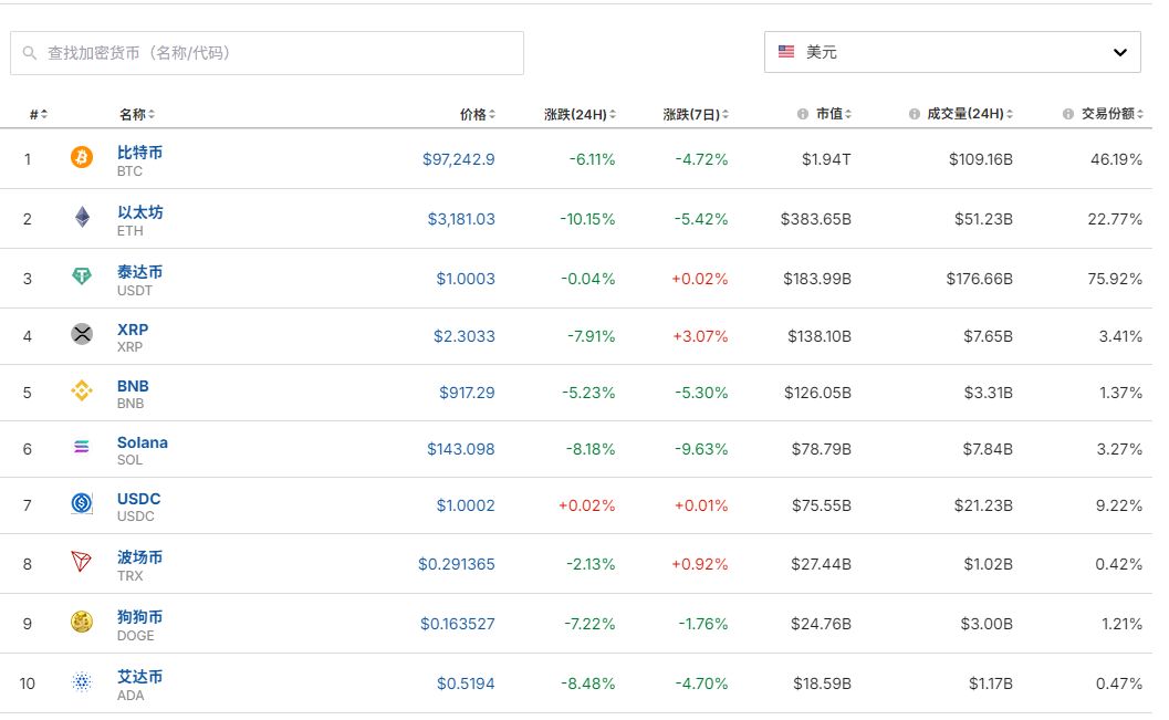比特币跌超6%以太坊跌超10%加密货币全网24小时超