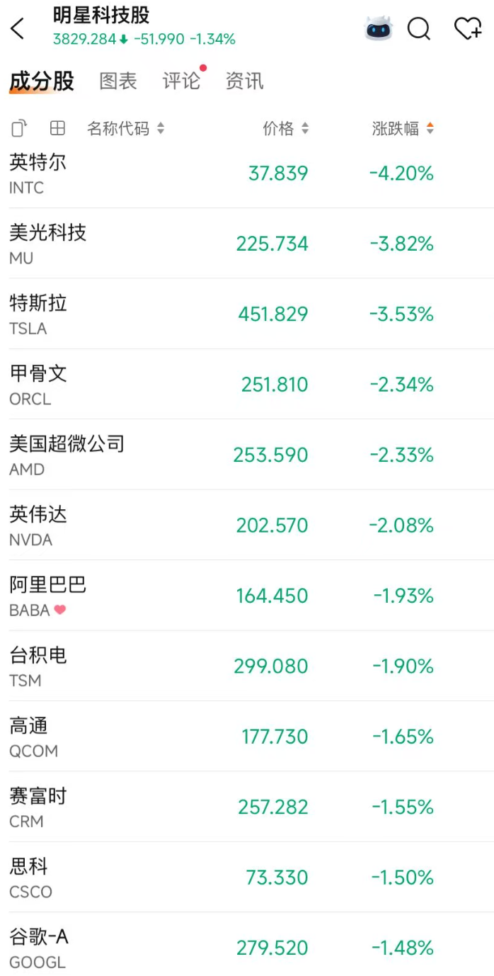 明星科技股多数下跌,截至发稿,英特尔跌超4%,特斯拉跌3.53%,英伟达跌超2%。