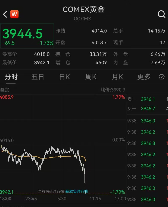 黄金跳水,现货黄金一度大跌1.8%。截至发稿,跌幅收窄至1.4%,报3944.9美元/盎司;COMEX黄金跌1.73%,报3944.5美元/盎司。
