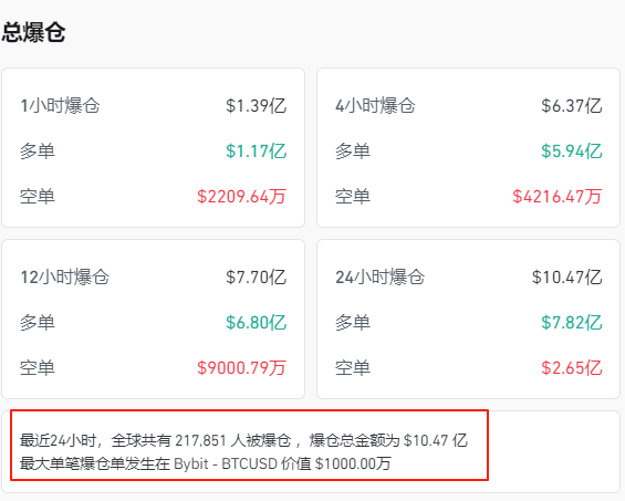 Coinglass网站数据显示,近24小时内,全球加密货币超21万人爆仓。