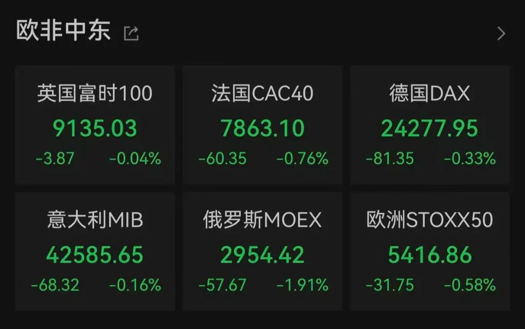 资本市场方面,欧洲市场暂时全线%,德国DAX指数跌超0.3%,俄罗斯MOEX股市更是跌近2%。