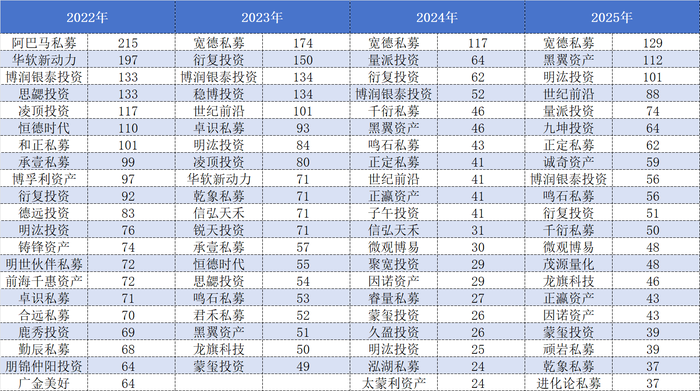 表格:2022年至2025年各年度备案产品数量居于前20名的私募管理人名单数据来源:Wind、界面新闻整理