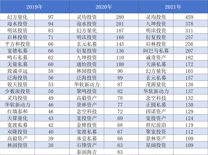 表格:2019年至2021年各年度备案产品数量居于前20名的私募管理人名单数据来源:Wind、界面新闻整理